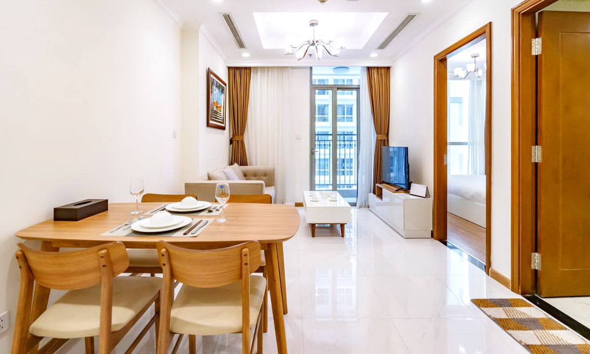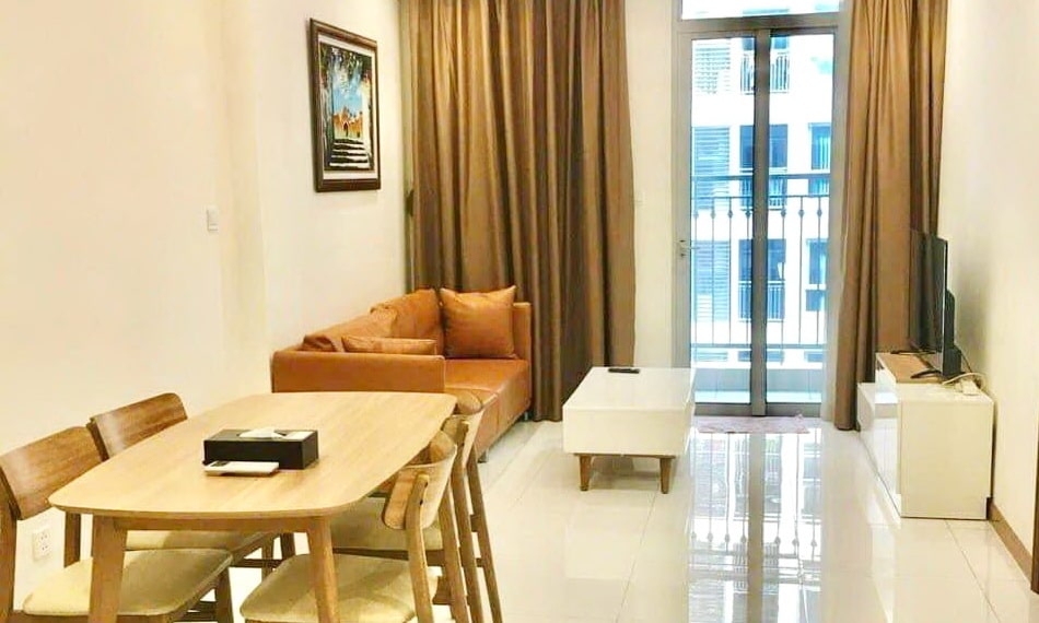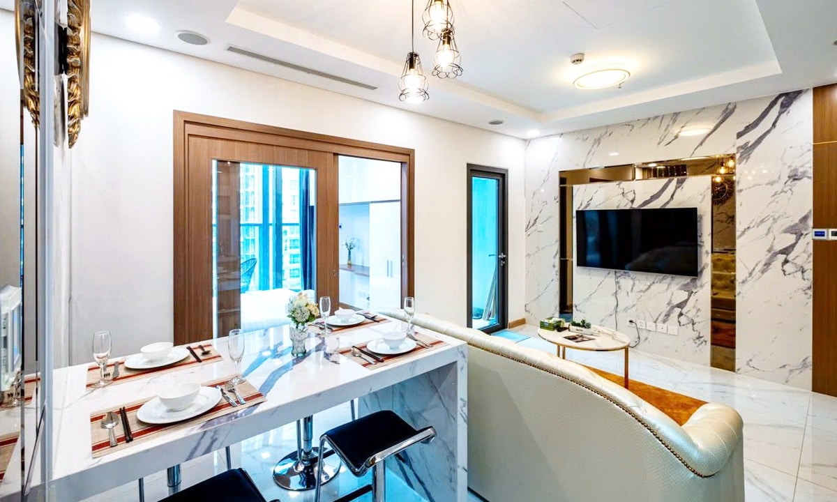 Nội thất trang bị đầy đủ. Toàn cảnh phòng khách biểu hiện được sự liên thông không gian phòng khách – bếp. Các căn hộ có hướng view rộng mở, thông thoáng, đón được khí trời tự nhiên, làn gió mát từ dòng sông cảnh quan, hoa viên xanh mát, hồ bơi trong veo.
